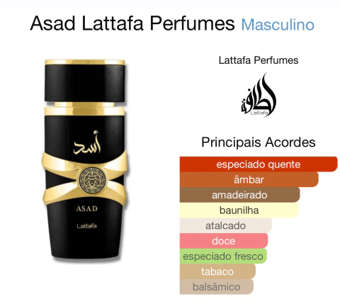 Asad de Lattafa Perfumes é um perfume Âmbar (Amadeirado)Masculino. Asad foi lançada em 2021. As notas de topo são: Pimenta Preta, Tabaco e Abacaxi. As notas de coração são: Patchouli, Café e Íris. As notas de fundo são: Baunilha, Âmbar, Madeira Seca, Benjoim e Ládano.