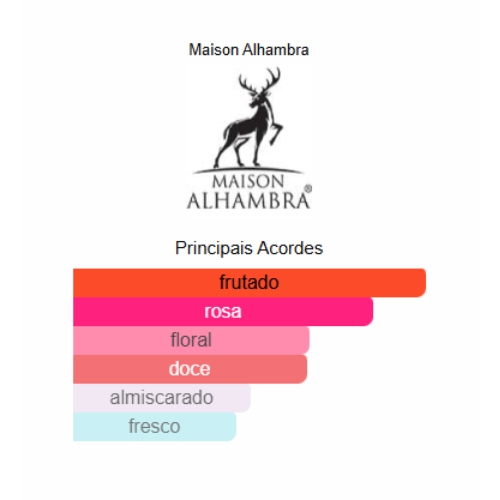 As notas de coração são: Rosa e Peônia. As notas de fundo são: Almíscar e Baunilha.