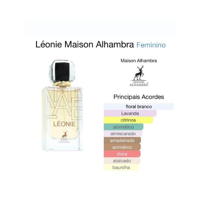 Léonie de Maison Alhambra é um perfume Floral Feminino. Léonie foi lançada em 2022. As notas de topo são: Lavanda, Mandarina, Petitgrain e Groselha Preta. As notas de coração são: Flor de Laranjeira, Lavanda e Jasmim. As notas de fundo são: Âmbar Cinzento, Baunilha, Cedro e Almíscar.