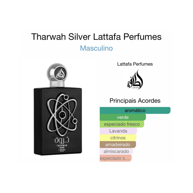 Tharwah Silver de Lattafa Perfumes é um perfume Aquático Amadeirado Masculino. Esta é uma nova fragrância. Tharwah Silver foi lançada em 2022. As notas de topo são: Hortelã e Bergamota. As notas de coração são: Sálvia Esclaréia e Lavanda. As notas de fundo são: Almíscar, Vetiver e Cedro.